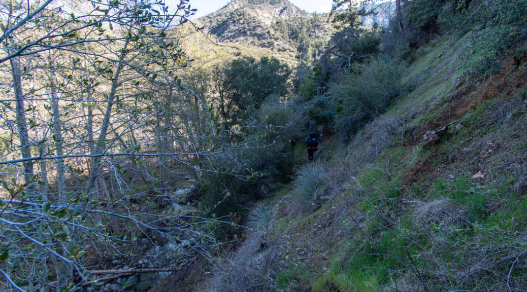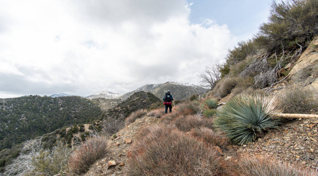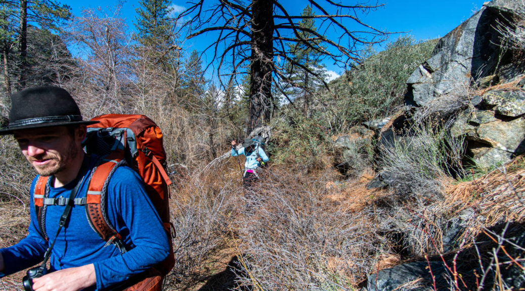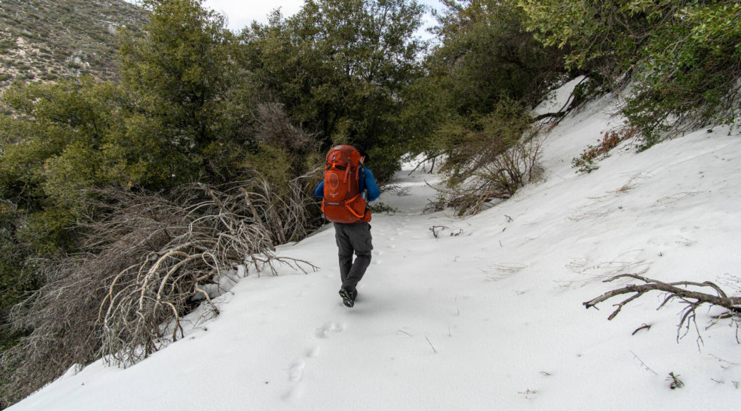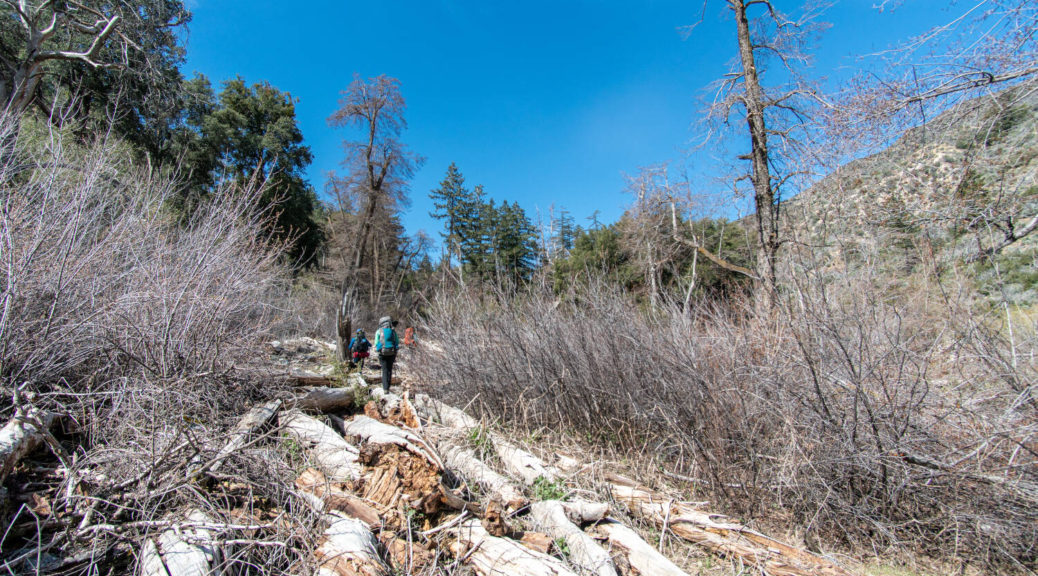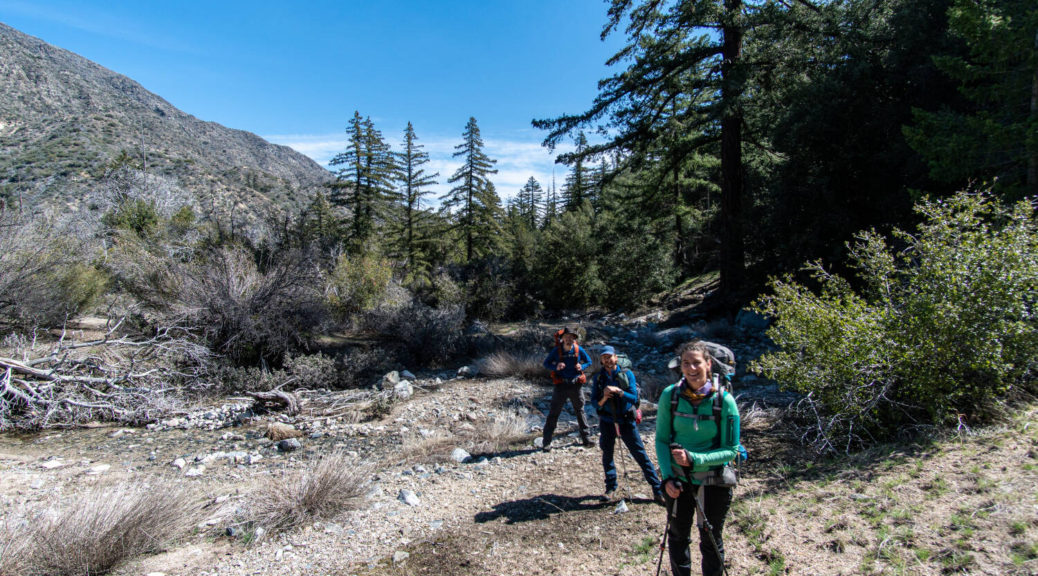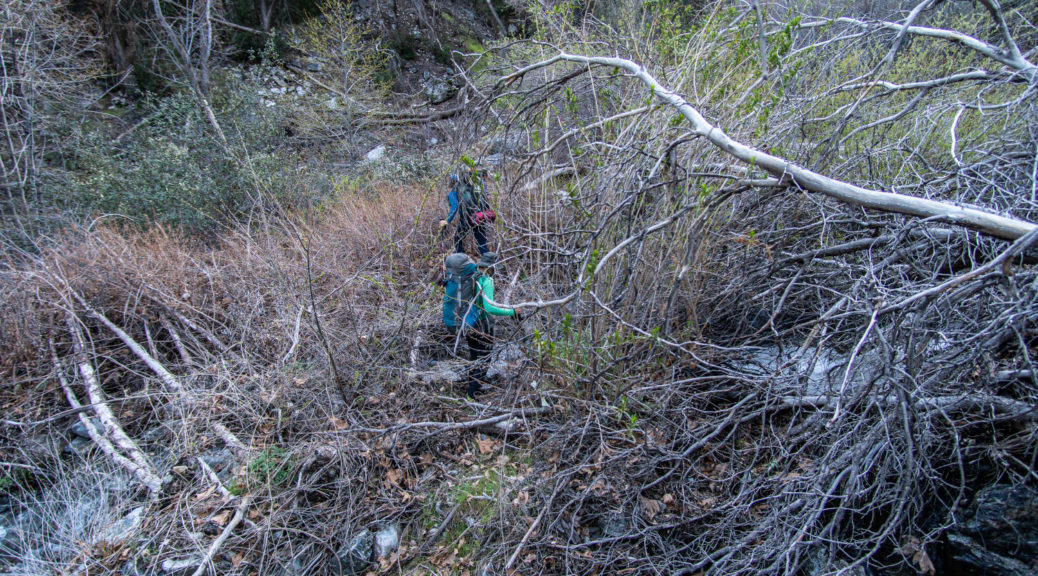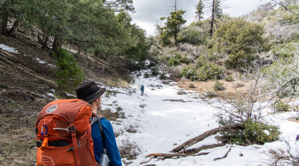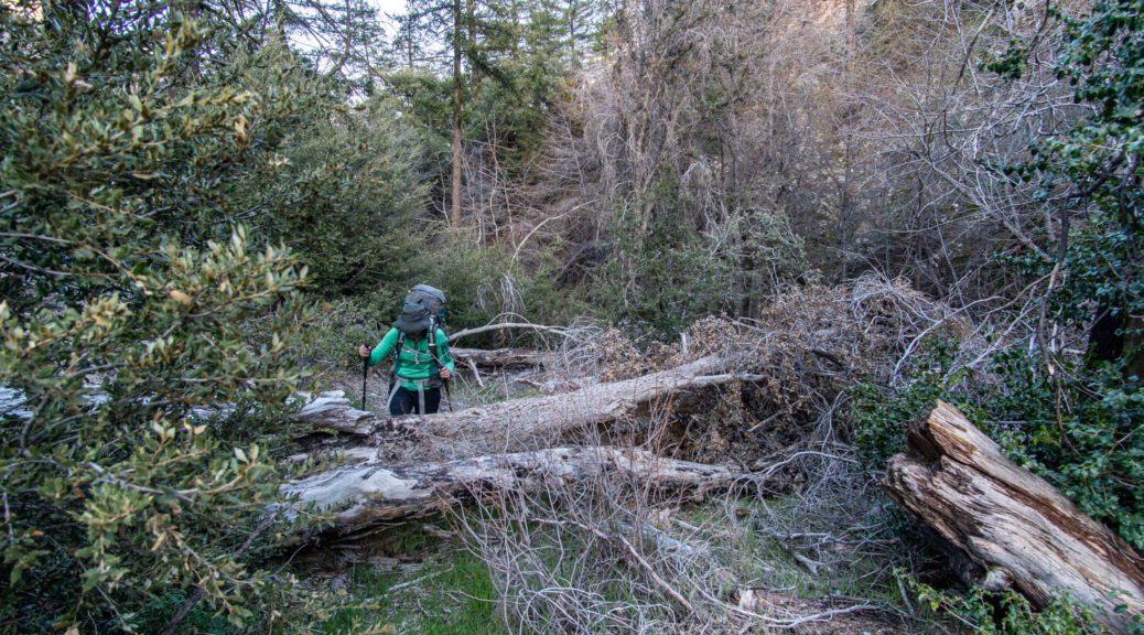 On top of that, this trip had some beautiful variety. We walked on a shut down road, bushwhacked along Buck Creek, climbed up and down on barely visible trails and through snow below Sewart Mountain, descended “canyon-like” Big Cedar Creek, hiked on a beautiful open ridge and finally connected the loop along the riparian environment of Piru Creek.
