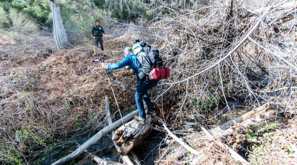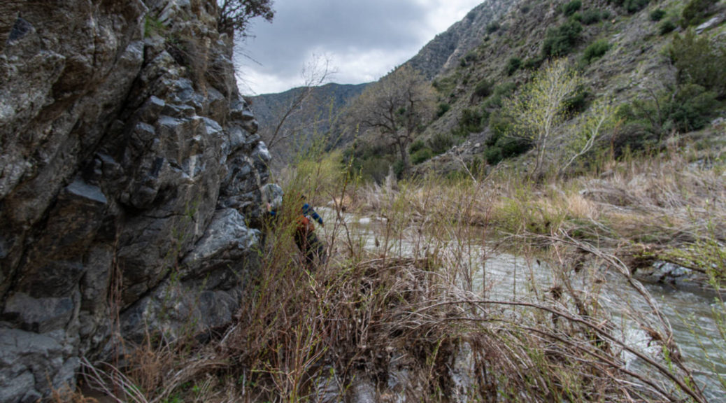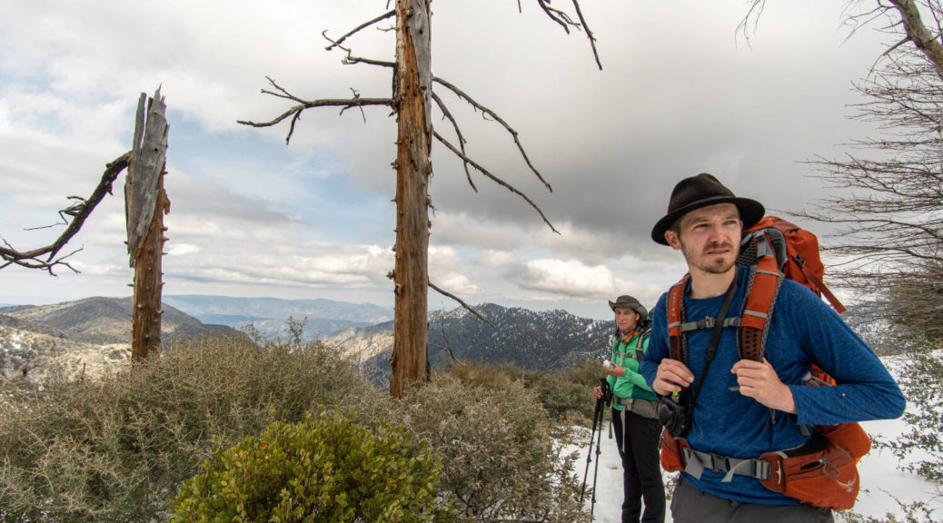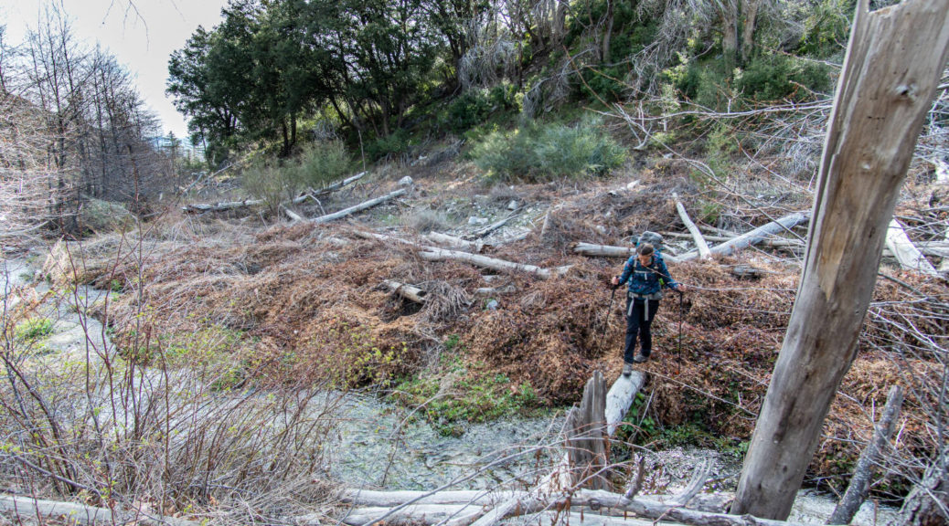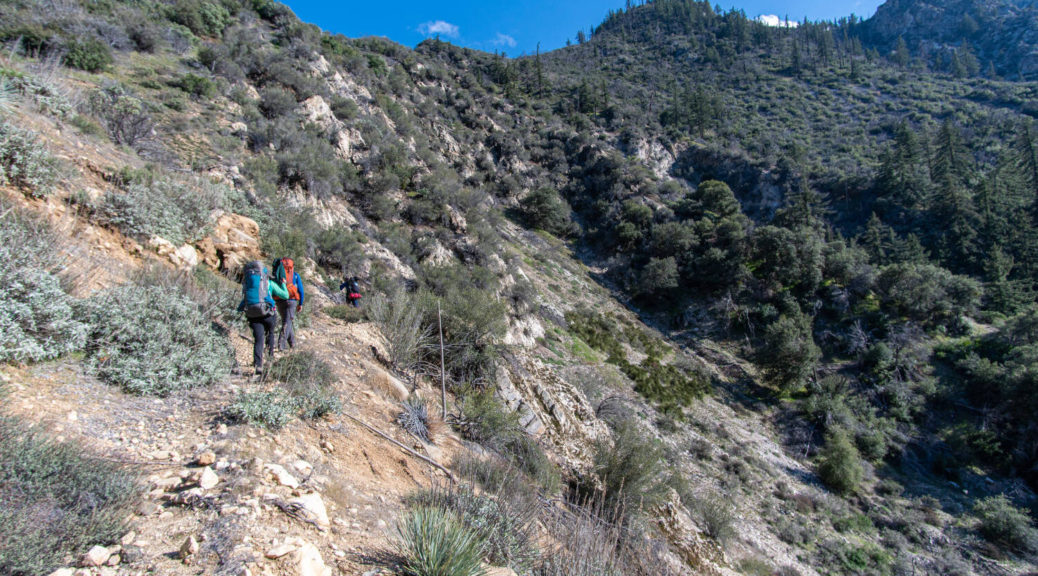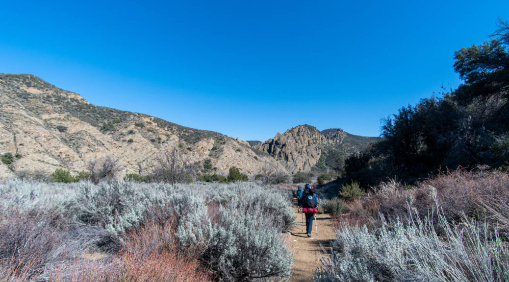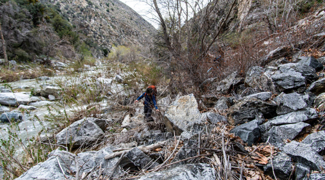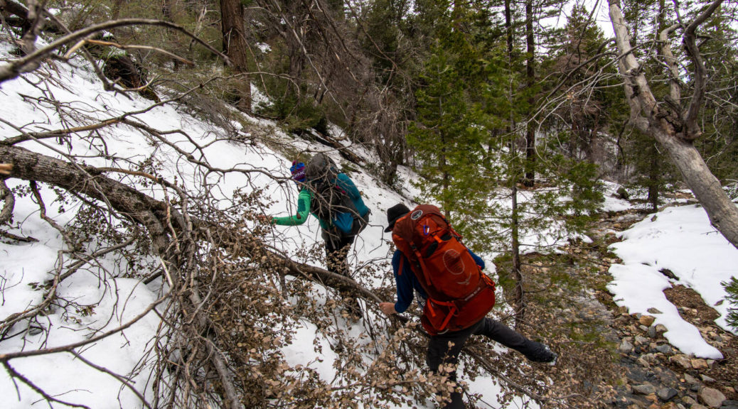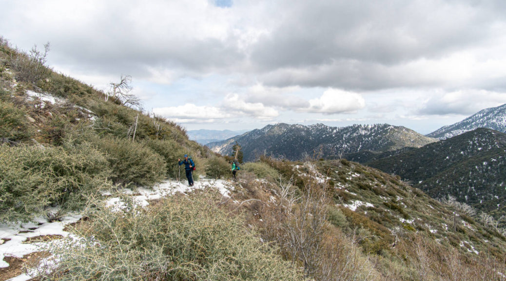 On top of that, this trip had some beautiful variety. We walked on a shut down road, bushwhacked along Buck Creek, climbed up and down on barely visible trails and through snow below Sewart Mountain, descended “canyon-like” Big Cedar Creek, hiked on a beautiful open ridge and finally connected the loop along the riparian environment of Piru Creek.